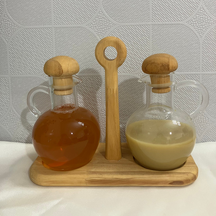 ست دو عددی جا آبلیمو و آبغوره شامل دو عدد ظرف پیرکس با درب بامبو واشر دار و همچنین ۱ عدد استند دسته دار چوبی می باشد.