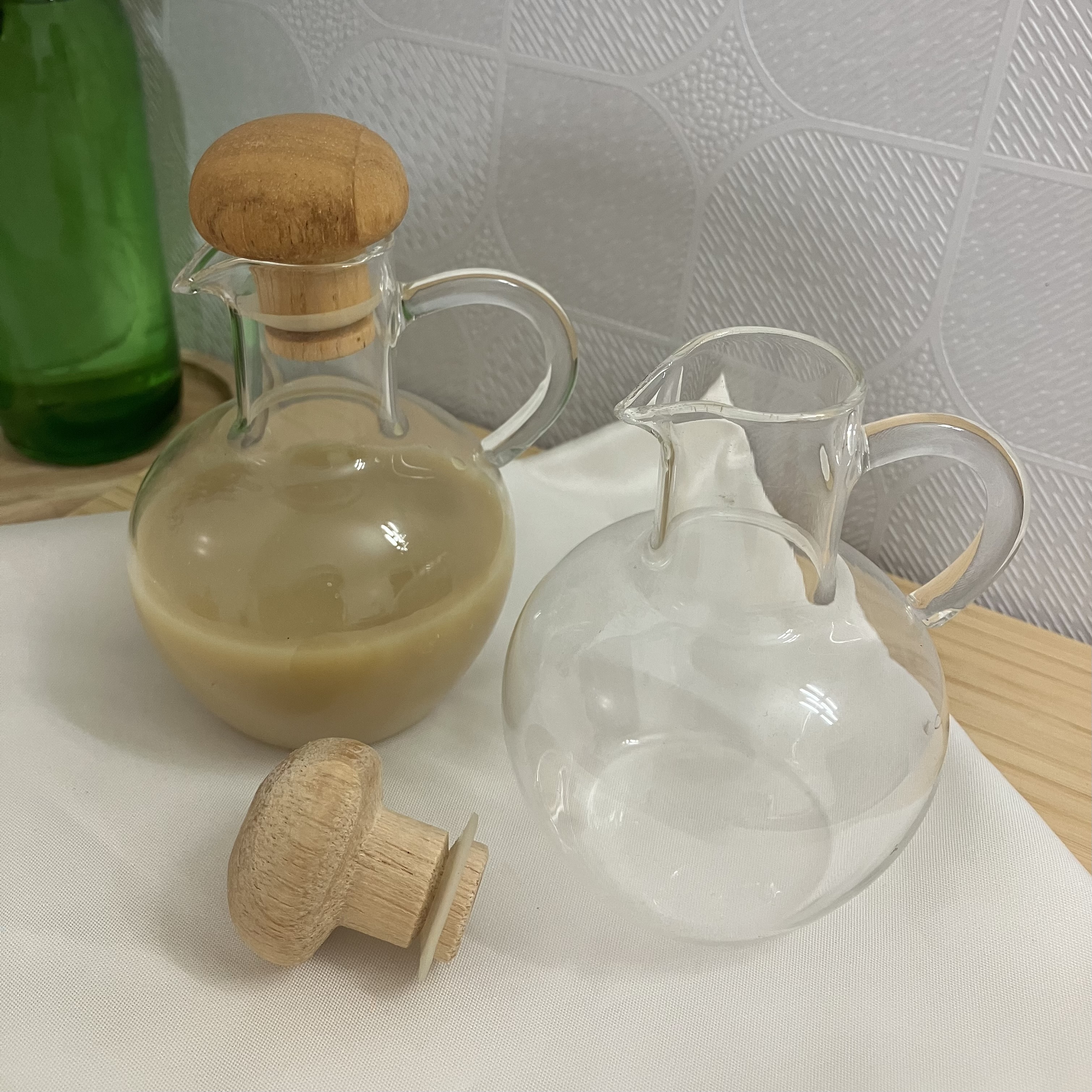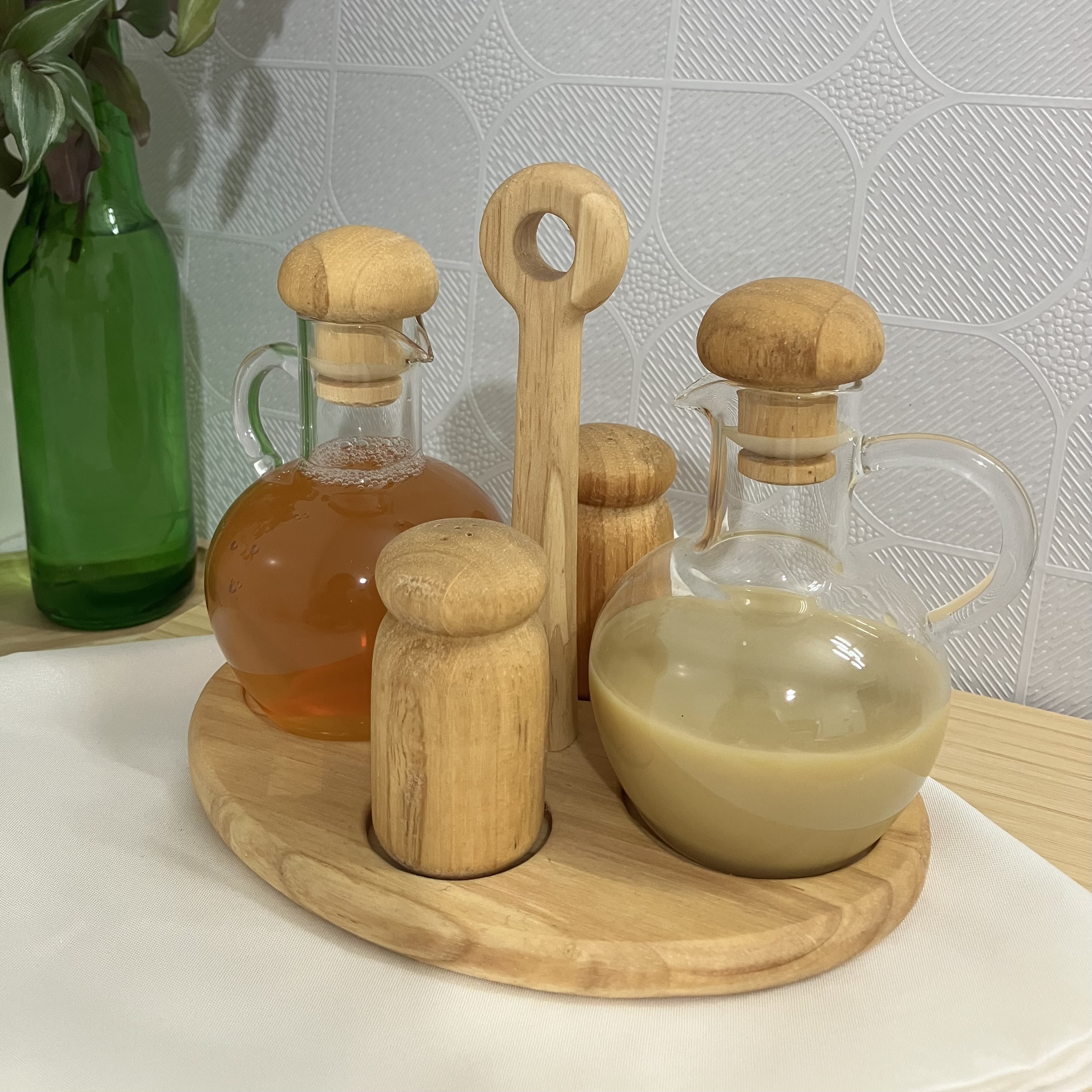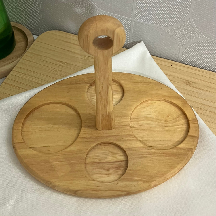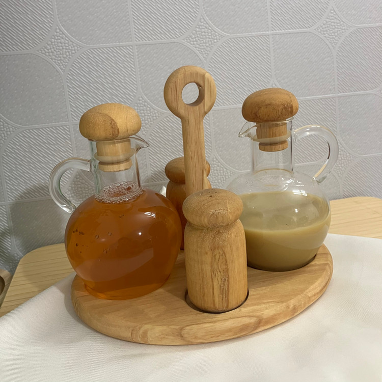 ست چهار عددی جا آبلیمو و آبغوره شامل دو عدد ظرف پیرکس با درب بامبو واشر دار + ۲ عدد جای نمک و فلفل + ۱ عدد استند دسته دار چوبی ۴ خانه می باشد.